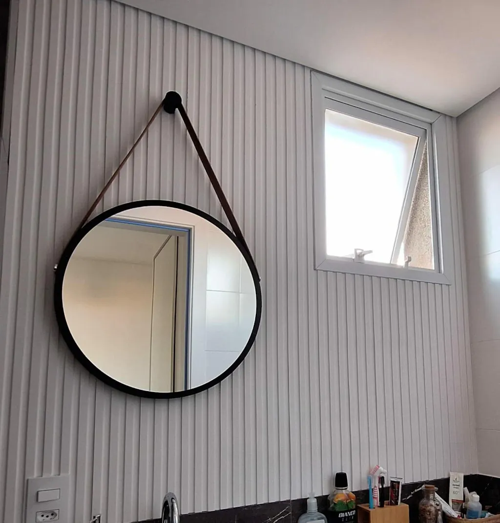 É muito fácil de instalar! Depois de cortar as ripas na medida desejada, é só remover o plástico de proteção e aplicar na parede.